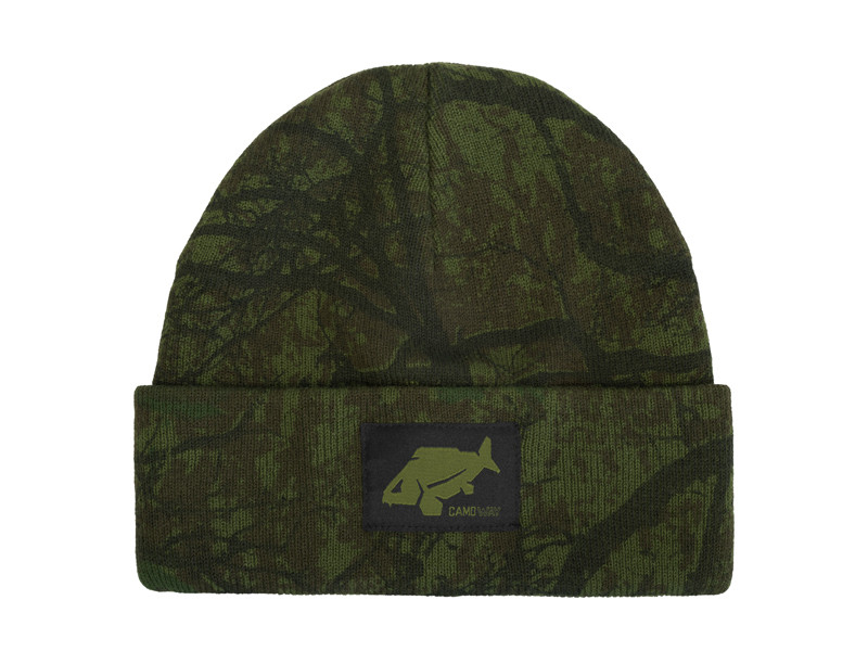 Stylowa czapka w kamuflażu z subtelnym motywem jesiennych drzew z naszym oryginalnym karpiowym wzorem OutLINE.