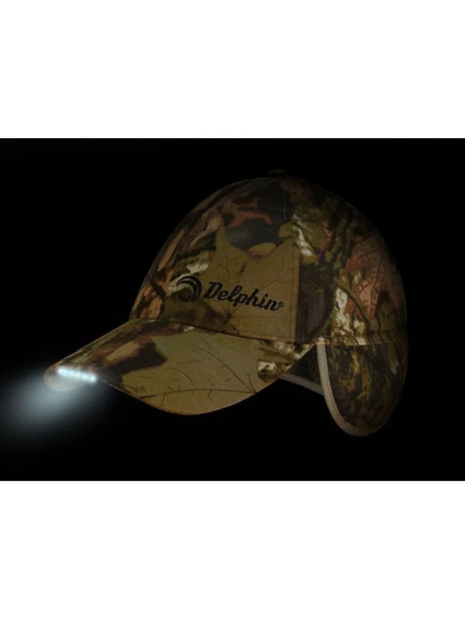 Zimowa czapka z daszkiem i ciepłą izolacją oraz diodami od marki Delphin, w kolorze maskującym. Zimowa czapka wędkarska w uniwersalnym wymiarze, posiada regulowany obwód czapki pozwoli ją dopasować każdemu wędkarzowi. Czapka jest zaopatrzona w latarkę umieszczoną w daszku (5 mocno świecących diod LED), która na pewno będzie pomocna podczas nocnych połowów. Diody LED emitują wystarczająco silny strumień światła, by w wielu wypadkach zastąpić czołówkę. Dyskretny włącznik LED znajduje się w daszku w spodniej części, jest zasilany przez 2 płaskie baterie CR 2032 3V umieszczone w tylnej części. Zaletą również jest chowana osłona na uszy i kark, która zakryje i ochroni te części ciała przed niskimi temperaturami.