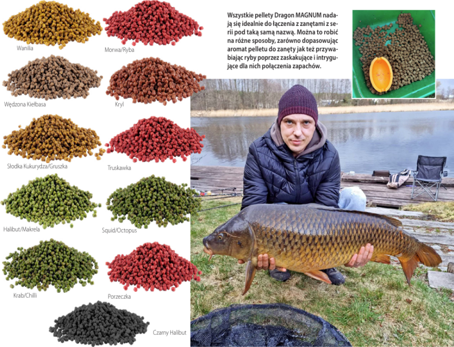 Pellet zanętowy Dragon MAGNUM produkowany jest wyłącznie z naturalnych składników nieszkodzących środowisku wodnemu. Charakteryzuje się nieprawdopodobną koncentracją smaku i zapachu, bardzo wysoką zawartością protein i wartością energetyczną. Przeznaczony jest do gruntowych oraz spławikowych technik połowów. Podczas pracy w łowisku stopniowo rozpuszcza się, tworząc chmurę zapachową wabiącą ryby. Dostępny jest w szerokiej gamie aromatów, a także w różnych wariantach zawartości protein.